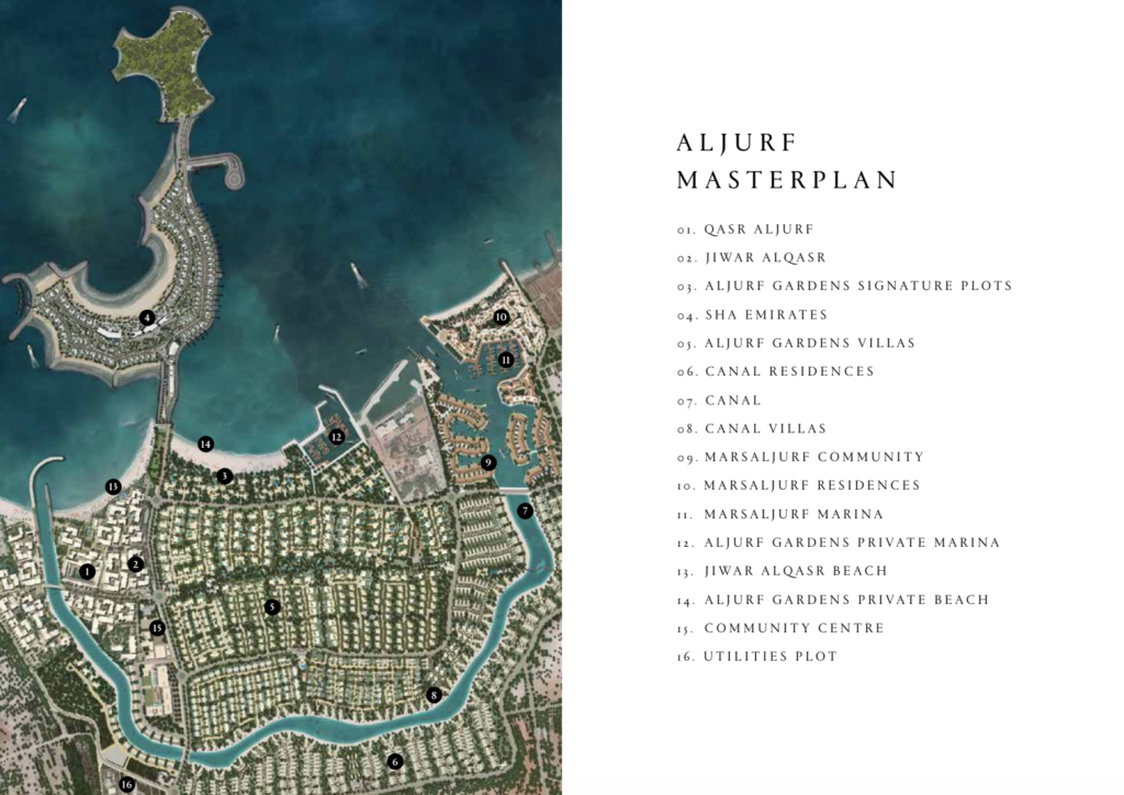 What & where: Al Jurf is a large, master-planned coastal destination on the Sahel Al Emarat coastline (between Abu Dhabi and Dubai) developed by IMKAN and partners. The masterplan includes beachfront, marina, parks and low-density villa neighbourhoods (Al Jurf Gardens, Naseem, etc.).