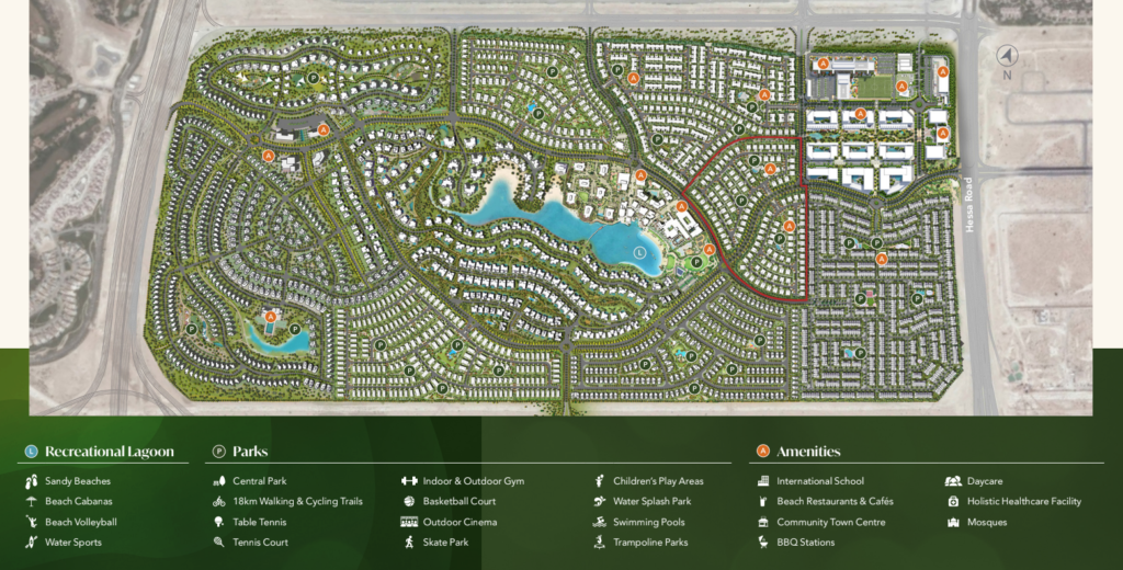Family-friendly amenity set — international school options, nurseries, healthcare access, retail and F&B planned inside/near the community (good for long-term residential demand).