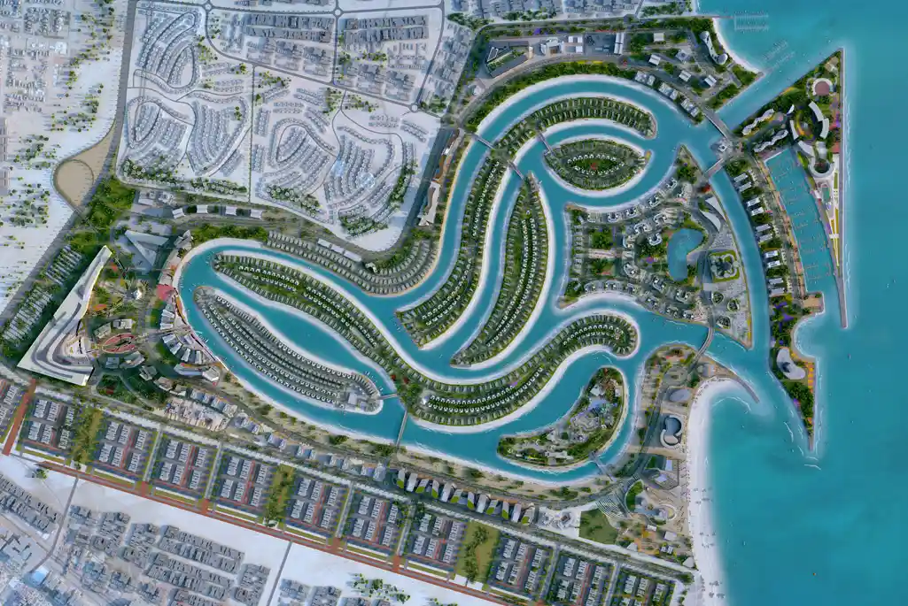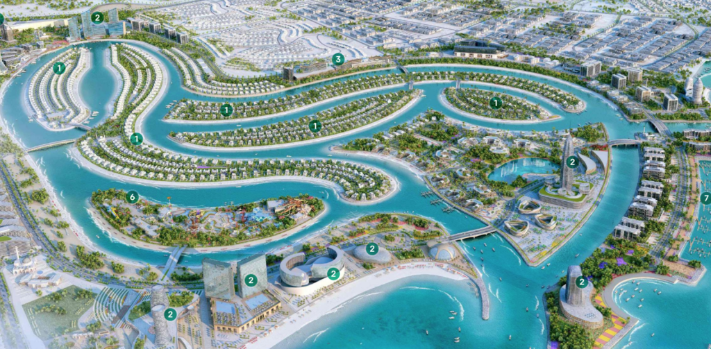 The development emphasizes sustainability, with 27% of the area dedicated to lush green spaces, and offers amenities such as freshwater lagoons, preserved mangrove forests, a luxury beach club, yacht club, waterfront boulevard, golf course, and business lounge.